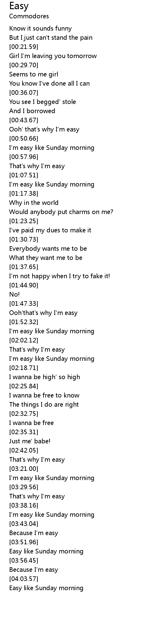 See i begged, stole and i borrowed, yeah. chorus ooh, that's why i'm easy. But i just can't stand the pain. I'm easy like sunday morning that's why i'm easy i'm easy like sunday morning why in the world would anybody put chains on me? Become a better singer in only 30 days, with easy video lessons!